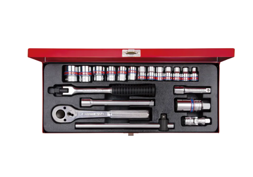 Zestaw narzędzi 3/8" King Tony w metalowej kasecie. W zestawie znajdują się:- 3330S nasadki krótkie 12-kątne calowe w rozmiarach: 1/4 , 5/16 , 11/32 , 3/8 , 7/16 , 15/32 , 1/2 , 9/16 , 19/32 , 11/16 , 3/4 , 13/16 , 7/8"- 363021 nasadka do świec 21 mm, - 3779-08F grzechotka z uchwytem moletowanym i blokadą, - 3221-03, 3221-06 dwie przedłużki, - 3452-08F pokrętło łamane, - 3571-08 pokrętło przesuwne - 3792 przegub Kardana Karta produktu - 3020SR02