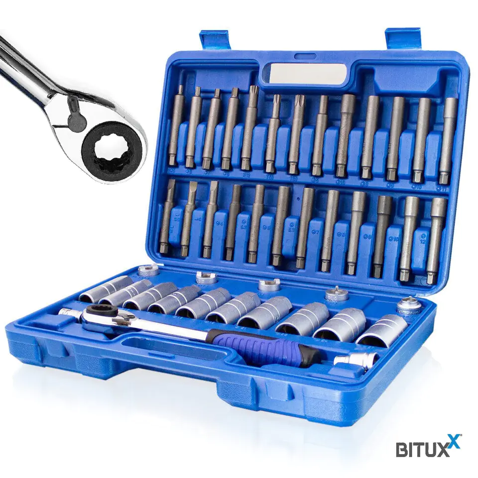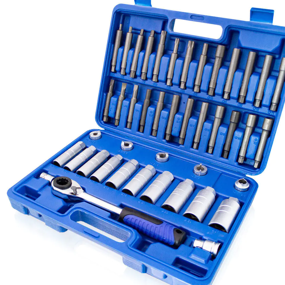 1x nasadka sześciokątna długa do luzowania 14 - 15 - 16 - 17 - 18 - 19 - 21 - 22 - 24 - 27 mm1x 2-pinowa nakrętka rowkowa do luzowania 10,5x3,5 mm, do Volkswagena1x 2-pinowa nakrętka rowkowa do luzowania 14,0x2,5 mm, do Mercedes-Benz1x 2-pinowa nakrętka rowkowa do luzowania 14,5x3 mm, do VAG1x 2-pinowa nakrętka rowkowa do luzowania: 14,5x5 mm, do Austin1x rowkowane wkładki profilowe do trzymania: 4 - 5,2 - 6 - 6,3 - 7 - 8 - 9 - 10 - 12 mm1x bity o profilu D do trzymania: 5 - 10 mm1x wkładki sześciokątne do trzymania: 8 - 9 - 10 - 11 mm1x bity sześciokątne do trzymania: 5 - 6 - 7 - 8 mm1x rowkowane bity profilowe do trzymania: 3 - 3,5 - 4 mm1x bit wielozębny M121x bit o profilu T (dla Torx) do trzymania: T50 - T601x 1x adapter do bitów z kulką ustalającą nasadka kwadratowa 12,5 mm (1/2") nasadka sześciokątna 10 mm (3/8")1x 1x adapter do bitów z kulką mocującą, nasadka czworokątna 10 mm (3/8"), nasadka sześciokątna 10 mm (3/8")1x przelotowe wyjście sześciokątne z grzechotką odwracalną 19 i 22mm