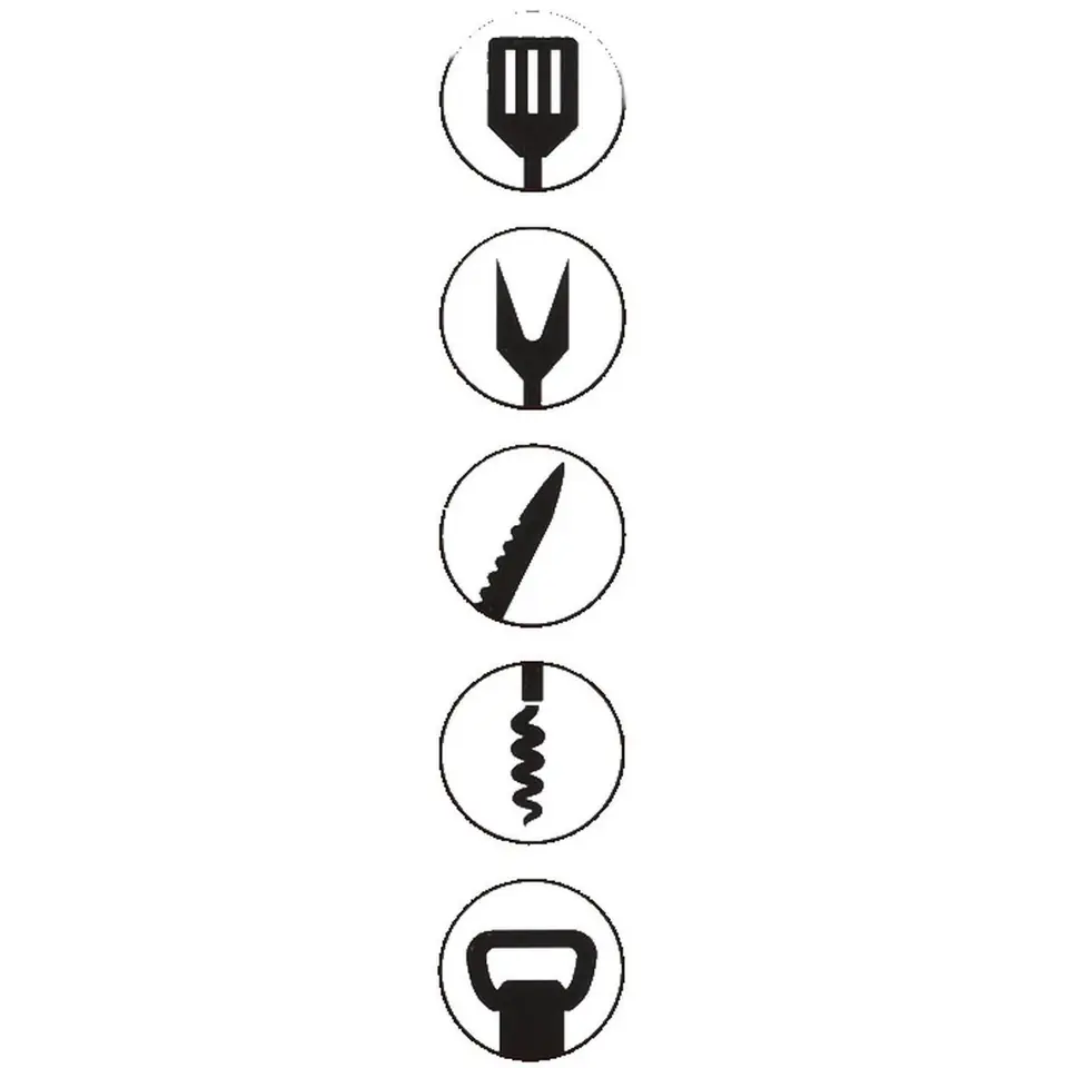 Zestaw 5w1 posiada 5 przydatnych narzędzi do obsługi jedzenia na grillu. Pełni kilka funkcji, które ułatwiają proces przygotowywania potraw na otwartym ogniu. Dzięki niemu możesz pokroić lub obracać mięso i warzywa na ruszcie, podnosić potrawy z grilla i uniknąć poparzeń, a co najważniejsze otworzyć napoje gazowane lub wino.