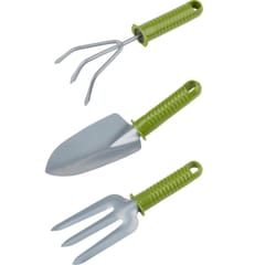 - W zestawie 3 narzędzia (łopatka, widełki, grabki)Materiał: tworzywo sztuczneKolor: szary, zielonyMarka: Kinzo