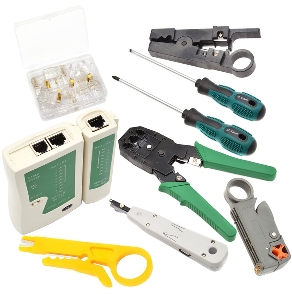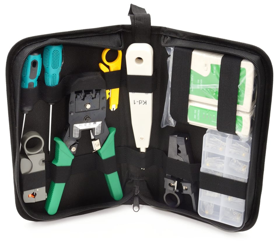 Zestaw narzędzi sieciowych RJ45 przeznaczony zarówno dla profesjonalistów, jak i użytkowników domowych. Zapakowany w praktyczne materiałowe etui.