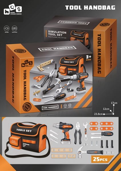 | Wymiary | - torba na narzędzia ok. 23,5 cm x 16 cm x 10,5 cm,- wiertarko-wkrętarka ok. 15 cm x 15 cm x 5 cm,- wymienne bity: płaski, krzyżakowy, wiertło ok. 6,5 cm długości,- wymienne końcówki do śrubokręta ok. 8 cm długości,- nasadka do śrubokręta ok. 8 cm x 2,5 cm,- młotek ok. 17 cm x 8 cm x 2 cm,- klucz płasko-oczkowy ok.14 cm x 4 cm x 1,5 cm,- kombinerki ok. 15 cm x 5 cm x 1,5 cm,- mniejsze elementy do wkręcania ok. 6 cm x 2,5 cm,- większe elementy do wkręcania ok. 9 cm x 2,5 cm,- drewienko różnej wielkości do wkręcania ok. 6,5 cm długości, ok. 12 cm i ok. 16 cm,- śruba ok. 5,5 cm długości,- nasadki ok.3 cm średnicy,- kołki rozporowe ok. 5 cm x 3 cm,- opakowanie ok. 23,5 cm x 17,5 cm x 12,5 cm. |