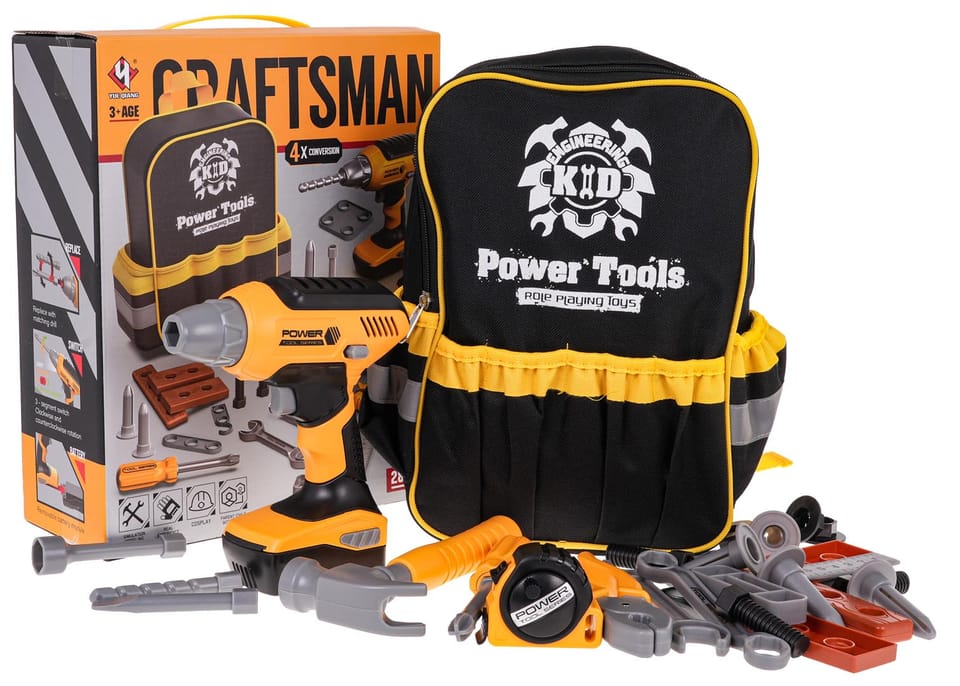 | Wymiary | - plecak na narzędzia ok. 30 cm x 26 cm x 9 cm,- wiertarko-wkrętarka ok. 17,5 cm x 15,5 cm x 5,5 cm,- wymienne bity do wkrętarki lub śrubokręta ok. 9 cm długości,- młotek ok. 17,5 cm x 8,5 cm x 3 cm,- klucz ok. 3,3 cm x 15 cm x 1 cm,- kombinerki ok. 14,3 cm x 5,5 cm x 2 cm,- kątownik ok. 8 cm x 14 cm x 1,5 cm,- nasadka do śrubokręta ok. 7 cm x 3 cm,- miarka ok. 6,5 cm x 5,5 cm x 2 cm,- 3 drewienka do wkręcania śrubek ok. 8 cm długości i 14 cm długości,- kołki rozporowe ok. 5,5 cm x 3 cm,- śrubki ok. 5,5 cm x 2 cm,- nakładki ok. 3 cm średnicy,- opakowanie ok. 30,5 cm x 25 cm x 11 cm. |