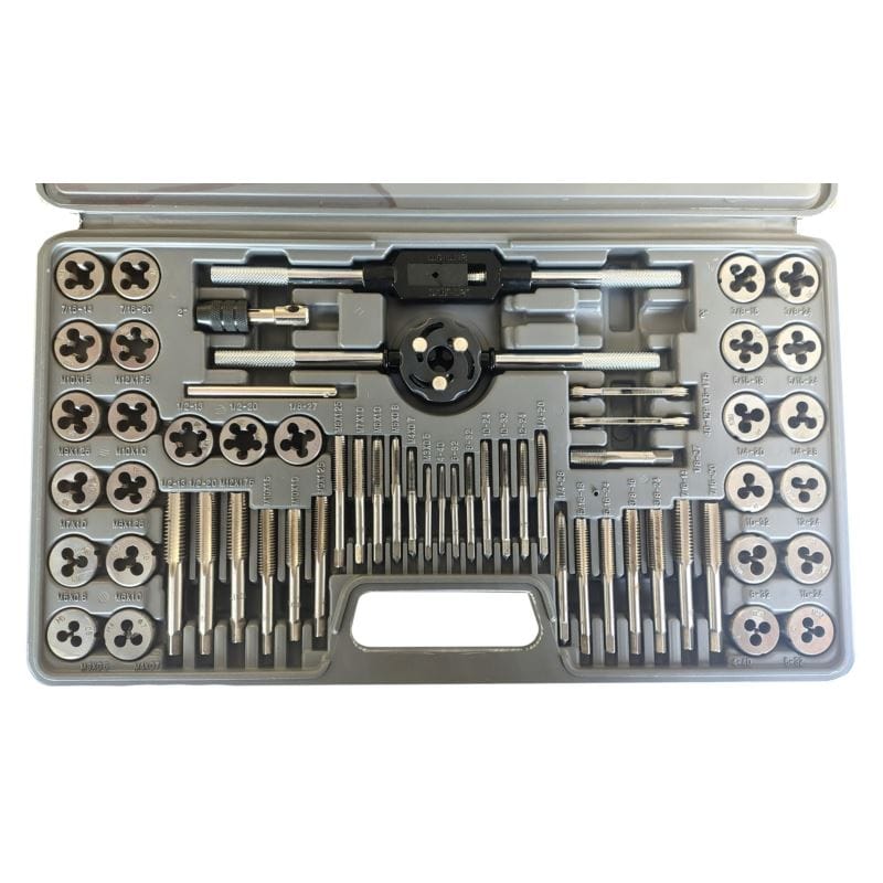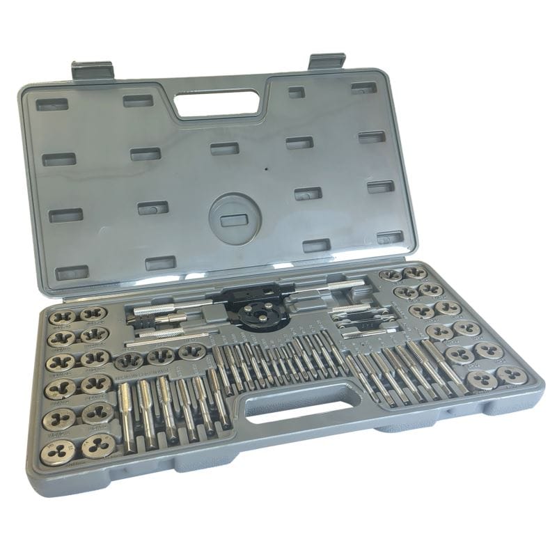 Metryczno - calowy zestaw narzynek umieszczony jest w plastikowej walizce, która segreguje narzędzia, jak i zapewnia wygodny oraz szybki dostęp do potrzebnych elementów.