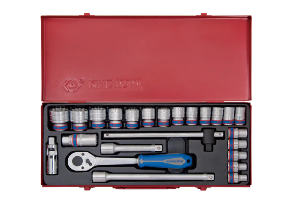 ZESTAW NASADEK 1/2" 24cz. KRÓTKIE 12-kąt. 10 - 32mm Z GRZECHOTKĄ I AKCESORIAMI, KASETA King Tony