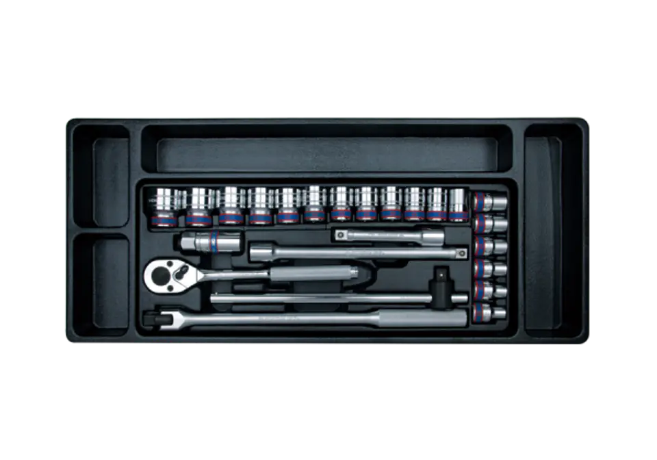 Zestaw narzędzi 1/2" King Tony we wkładzie do wózka warsztatowego King Tony. W zestawie znajdują się nasadki krótkie, 6-kątne w rozmiarach [ mm ]: 10, 11, 12, 13, 14, 15, 16, 17, 18, 19, 20, 21, 22, 23, 24, 27, 30, 32, nasadka do świec, 6-kątna, 21 mm, grzechotka z moletowaną rączką, pokrętło przesuwne, pokrętło łamane oraz dwie przedłużki. Karta produktu - 9-4526MR