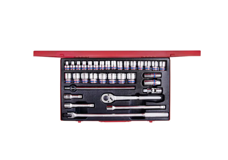 Zestaw 33 narzędzi 1/2" King Tony. W zestawie znajdują się wszystkie nasadki 6-kątne z zakresu 8 - 32 mm. Oprócz tego w zestawie 6-kątna nasadka do świec 21 i 16 mm, przegub Kardana, trzy chromowane przedłużki, grzechotka z moletowanym uchwytem, pokrętło łamane oraz pokrętło przesuwne. Karta produktu - 4534MR