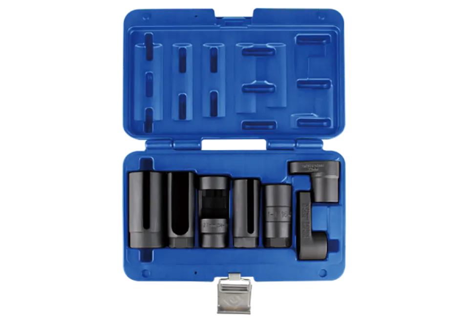 Zestaw nasadek do demontażu sond lambda (7 elementów) przeznaczony do prac serwisowych dla większości marek samochodowych m. in. VW, BMW, PSA, Mercedes, Ford itd. W zestawie 3 nasadki z napędem 1/2" w rozmiarach 22, 27, 29 mm i 4 nasadki z napędem 3/8" w rozmiarach 22, 27 mm o różnych profilach (patrz zdjęcie nr 2).