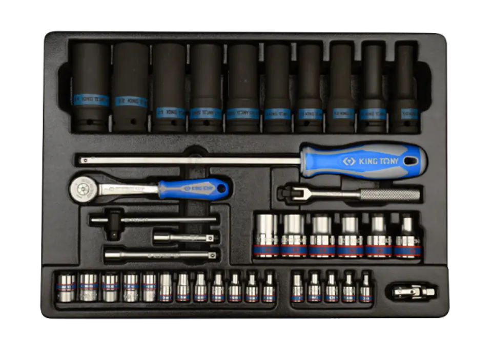 Zestaw narzędzi 1/4" i 1/2" King Tony we wkładzie do wózka warsztatowego. W zestawie znajdują się nasadki 1/4" krótkie, 6-kątne w rozmiarach 4, 4.5, 5, 5.5, 6, 7, 8, 9, 10, 11, 12, 13, nasadki gwiazdkowe 1/4" E4, E5, E6, E7, E8, nasadki 1/2" gwiazdkowe E10, E12, E14, E16, E18, E20 oraz nasadki długie udarowe, 1/2" 6-kątne 10, 11, 12, 13, 14, 17, 19, 21, 22, 24, przegub Kardana 1/4", grzechotka 1/4" z gumową rączką, pokrętło przesuwne 1/4", pokrętło łamane 1/4", uchwyt wkrętakowy do nasadek 1/4" oraz dwie przedłużki 1/4" Karta produktu - 9-7540MR