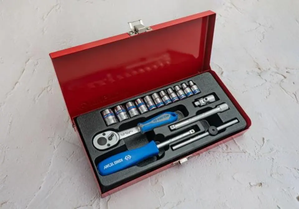 Zestaw narzędzi 1/4" w metalowej kasecie. W zestawie znajdują się nasadki 6-kątne, krótkie w rozmiarach [ mm ]: 4, 4.5, 5, 5.5, 6, 7, 8, 9, 10, 11, 13, grzechotka z gumową rączką, przedłużka, uchwyt wkrętakowy do nasadek, pokrętło Kardana oraz pokrętło przesuwne. Zestaw w metalowej kasecie Karta produktu - 2516MR