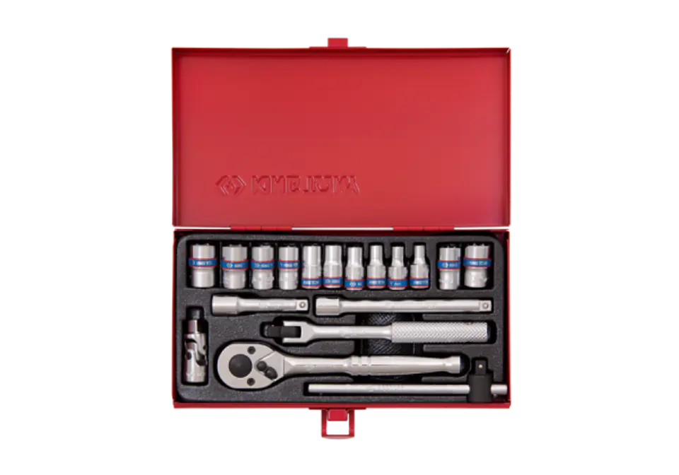 Zestaw profesjonalnych nasadek 1/4" firmy King Tony. W zestawie oprócz nasadek 12 kątnych znajduje się grzechotka, pokrętło łamane, dwie przedłużki, pokrętło przesuwne oraz przegłub kardana, a także dwie nasadki 8 kątne o rozmiarach 8 i 10 mm. Nasadki 12 kątne wchodzące w skład kompletu mają rozmiary 4, 4.5, 5, 6, 7, 8, 9, 10, 11, 12 [ mm ], Zestaw znajduje się w zgrabnej metalowej kasecie. Karta produktu - 2019MR