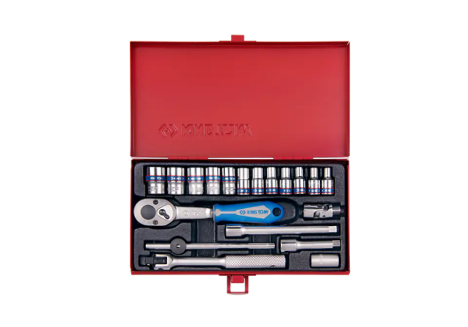 19 częściowy zestaw narzędzi na 1/4" profesjonalnej marki King Tony. W zestawie znajdują się wysokiej klasy narzędzia, przeznaczone głównie do pracy zawodowej mechaników samochodowych. W skład kompletu wchodzą nasadki 12 kątne w rozmiarach 4, 4.5, 5, 5.5, 6, 7, 8, 9, 10, 11, 12, 13 [ mm ], grzechotka 1/4" z gumową rączką, pokrętło łamane, pokrętło przesuwne, dwie przesłużki, przegub Kardana oraz uchwyt do bitów. Zestaw w stylowej metalowej kasecie. Karta produktu - 2021MR