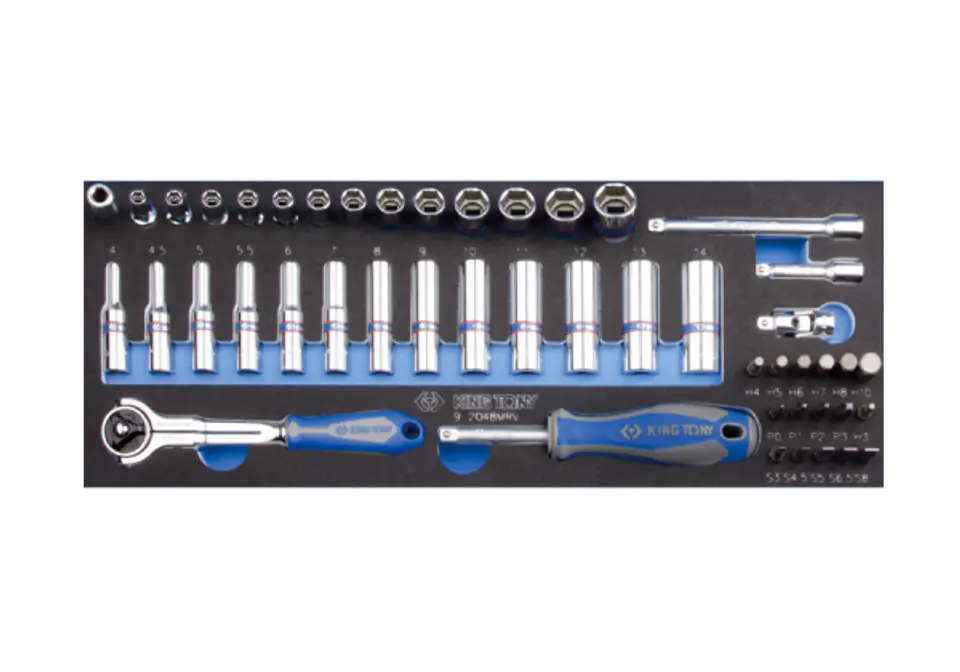 Zestaw narzędzi 1/4” we wkładzie z pianki o wymiarach 140 x 375 mm. W zestawie znajdują się narzędzia: bity 1/4” PH0, PH1, PH2, PH3, bity imbusy (HEX) H3, H4, H5, H6, H7, H8, H10, bity płaskie 3, 4.5, 5, 6.5, 8, nasadki krótkie 1/4” 6-kątne w rozmiarach: 4, 4.5, 5, 5.5, 6, 7, 8, 9, 10, 11, 12, 13, 14 mm, nasadki długie 1/4” 6-kątne w rozmiarach 4, 4.5, 5, 5.5, 6, 7, 8, 9, 10, 11, 12, 13, 14 mm, przedłużki uchylne 1/4” o długości 55 i 100 mm, grzechotka 1/4” z obrotową głowicą King Tony 2752-06G 72 zęby, adapter do bitów 1/4” na grzechotkę, wkrętak na nasadki 1/4”, przegub kardana 1/4”. Narzędzia wykonane są z wysokiej jakości stali chromo-wanadowej.