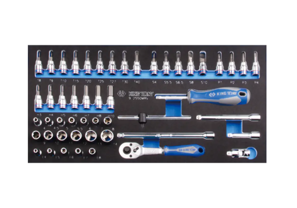 Zestaw narzędzi 1/4” King Tony we wkładzie z pianki o wymiarach 187 x 375 mm. W zestawie znajdują się narzędzia: nasadki z bitem 1/4” PH1, PH2, PH3, PH4, nasadki z bitem imbusowe (HEX) H3, H4, H5, H6, H7, H8, H10, nasadki z bitem płaskim 4, 5.5, 6.5, 8, 10, nasadki z bitem TORX w rozmiarach T8, T9, T10, T15, T20, T25, T27, T30, T40, nasadki krótkie 1/4” 6-kątne w rozmiarach: 4, 4.5, 5, 5.5, 6, 7, 8, 9, 10, 11, 12, 13, 14 mm, nasadki krótkie gwiazdkowe 1/4” w rozmiarach E4, E5, E6, E7, E8, przedłużka 1/4” o długości 54 mm, przedłużki uchylne/sztywne o długości 100 i 150 mm, pokrętło przesuwne 1/4”, grzechotka 1/4” King Tony 2771-55G 24 zęby, wkrętak na nasadki 1/4”, przegub kardana 1/4”. Narzędzia wykonane są z wysokiej jakości stali chromo-wanadowej.