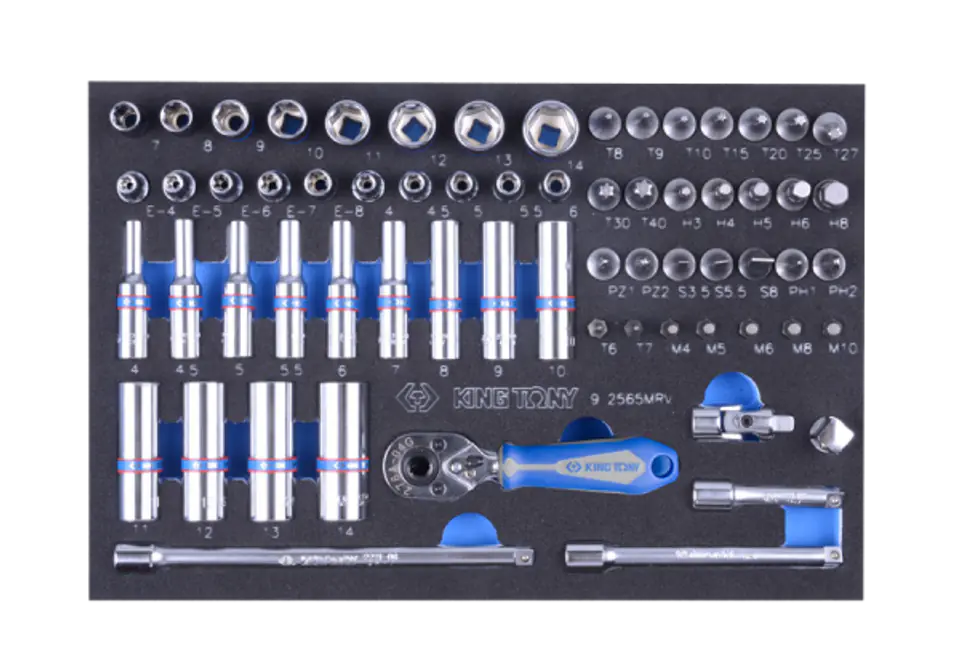 ZESTAW NASADEK 1/4" 65cz. KRÓTKIE / DŁUGIE, 6-kąt. 4 - 14mm Z AKCESORIAMI, WKŁAD Z PIANKI EVA DO WÓZKA King Tony