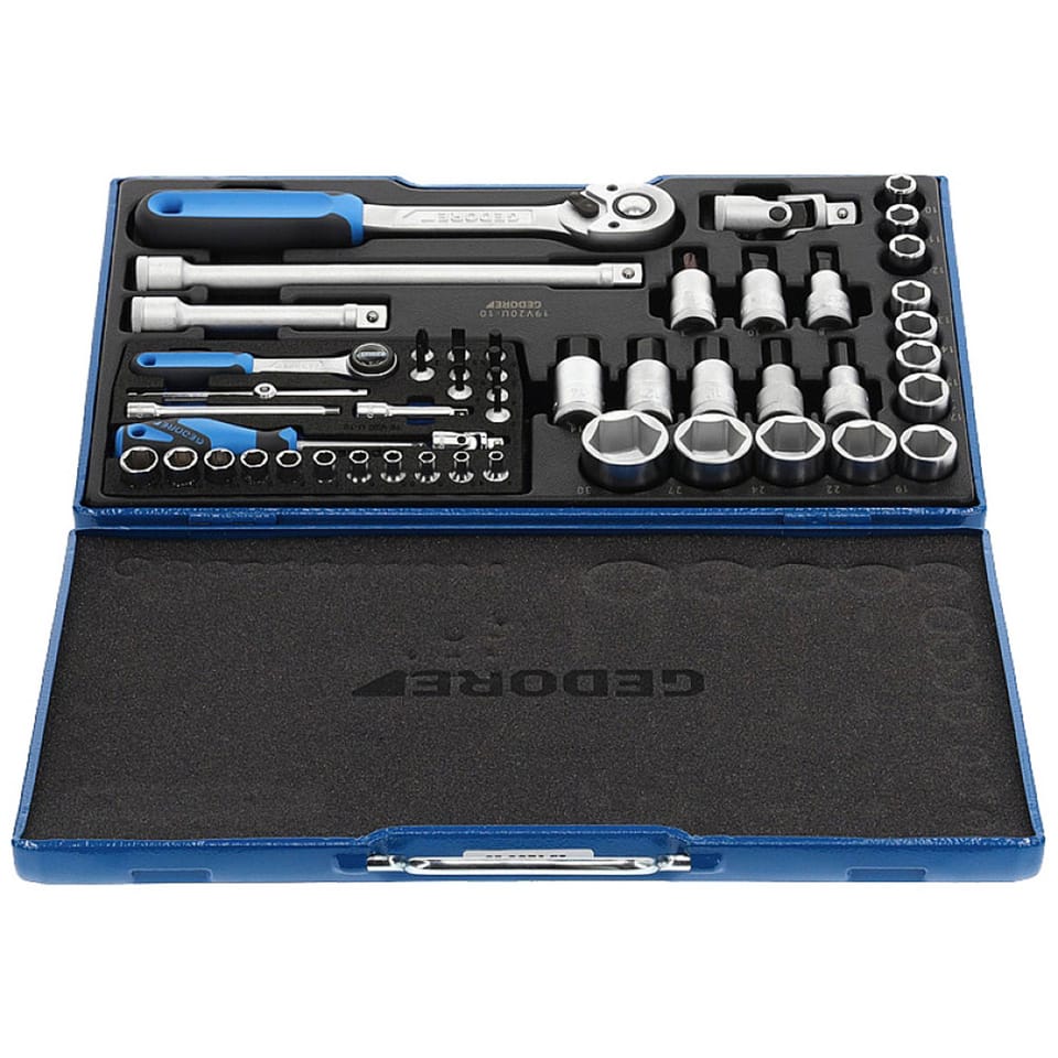 Wykonanie: Stal wanadowa 31CrV3 GEDORE, szlifowane i chromowane. Dostawa w niebieskiej kasecie z blachy stalowej GEDORIT z wypełnieniem z tworzywa sztucznego.