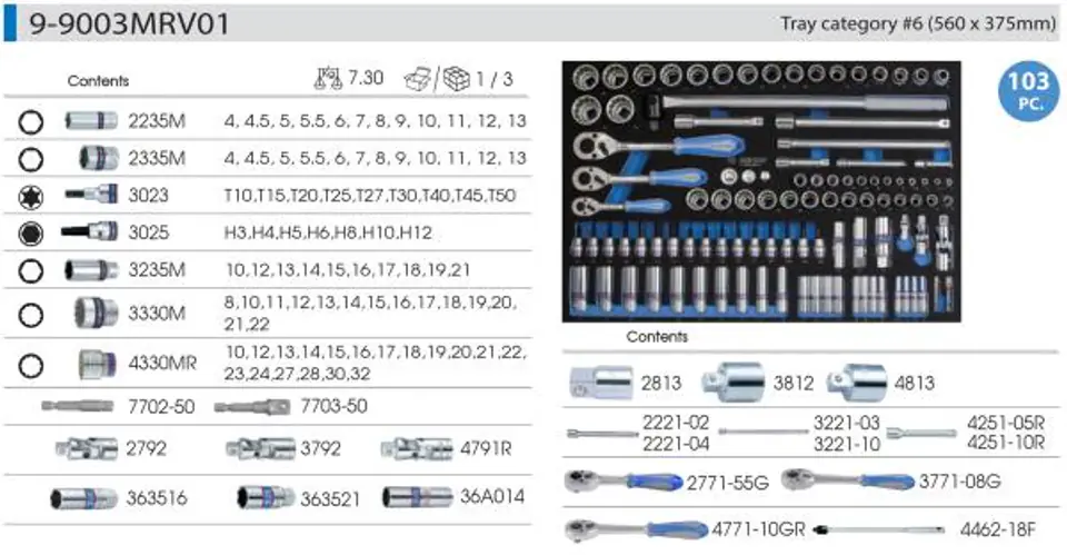 Zestaw narzędzi we wkładzie piankowym (EVA) dedykowany do wózka warsztatowego. Zestaw zawiera: - nasadki długie 6-kątne 1/4" w rozmiarach 4, 4.5, 5, 5.5, 6, 7, 8, 9, 10, 11, 12, 13 mm, - nasadki krótkie 6-kątne 1/4" w rozmiarach 4, 4.5, 5, 5.5, 6, 7, 8, 9, 10, 11, 12, 13 mm, - nasadki z bitem TORX 3/8" o długości 50 mm: T10, T15, T20, T25, T27, T30, T40, T45, T50, - nasadki z bitem HEX 3/8" o długości 50 mm: H3, H4, H5, H6, H8, H10, H12, - nasadki długie 6-kątne 3/8" w rozmiarach 10, 12, 13, 14, 15, 16, 17, 18, 19, 21 mm, - nasadki krótkie 12-kątne 3/8" w rozmiarach 8, 10, 11, 12, 13, 14, 15, 16, 17, 18, 19, 20, 21, 22 mm, - nasadki do świec 6-kątne 3/8" w rozmiarach 16, 21 mm, - nasadka do świec 12-kątna 3/8" 14 mm, - nasadki krótkie 12-kątne 1/2" w rozmiarach 10, 12, 13, 14, 15, 16, 17, 18, 19, 20, 21, 22, 23, 24, 27, 28, 30, 32 mm, - grzechotka 1/4" z przyciskiem zwalniającym 24 zęby, - grzechotka 1/4" z przyciskiem zwalniającym 32 zęby, - grzechotka 1/4" z przyciskiem zwalniającym 32 zęby, - przedłużki 1/4" 54, 100 mm, 3/8" 75, 250 mm, 1/2" 125, 250 mm, - przegub kardana 1/4", 3/8", 1/2", - pokrętło łamane 1/2", - adapter 1/4" na 3/8", - redukcje 3/8" na 1/4" oraz 1/2" na 3/8", - uchwyt trzpieniowy do wkrętarek 1/4" na nasadki 1/4" oraz 3/8", długość 50 mm. Wymiary wkładu: 560 x 375 mm.