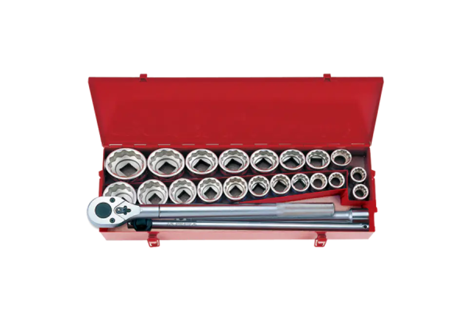 Zestaw metrycznych i calowych nasadek oraz narzędzi 3/4" firmy King Tony. Zestaw w metalowej kasecie zawiera 20 nasadek 12 kątnych oraz grzechotkę z moletowanym uchwytem, dwie przedłużki i pokrętło przesuwne. Zawarte w zestawie, krótkie nasadki 12-kątne są w rozmiarach metrycznych: 22, 24, 27, 30, 32, 36, 38, 41, 46, 50 oraz calowych 1", 1-1/8", 1-1/4", 1-5/16", 1-3/8", 1-7/16", 1-1/2", 1-5/8", 1-3/4", 2" Karta produktu - 6224CR
