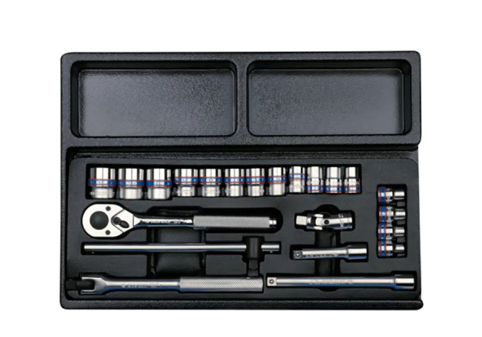 Zestaw narzędzi 3/8" King Tony we wkładzie do wózka warsztatowego. W zestawie znajdują się nasadki krótkie, 6-kątne 6, 7, 8, 9, 10, 11, 12, 13, 14, 15, 16, 17, 19, 20, 21, 22, grzechotka z moletowanym uchwytem, dwie chromowane przedłużki, pokrętło przesuwne, pokrętło łamane oraz przegub Kardana Karta produktu - 9-3523MR