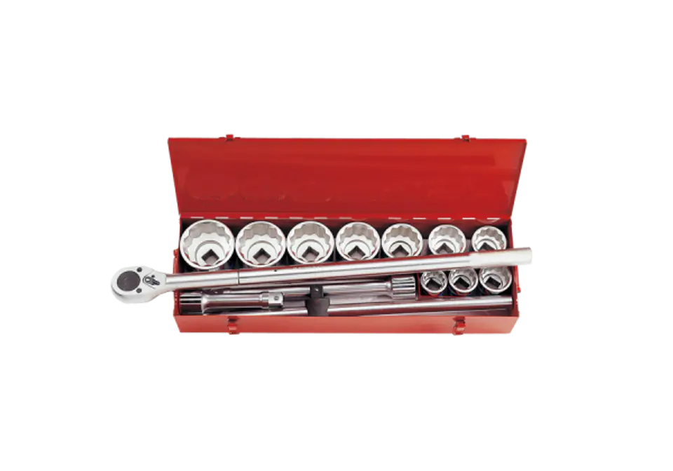 Zestaw narzędzi 1" King Tony w metalowej kasecie. W zestawie znajdują się nasadki 1", krótkie, 12-kątne w rozmiarach calowych 1-7/16", 1-1/2", 1-11/16", 1-7/8", 2", 2-1/4", 2-3/8", 2-5/8", 2-15/16", 3-1/8", grzechotka z moletowanym uchwytem, dwie przedłużki oraz pokrętło przesuwne. Karta produktu - 8015SR