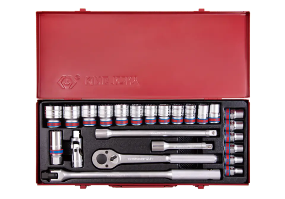 Zestaw narzędzi 1/2" King Tony w metalowej kasecie. W zestawie znajdują się calowe nasadki, krótkie, 12-kątne[ mm ]: 5/16", 3/8", 7/16", 15/32", 1/2", 9/16", 19/32", 5/8", 11/16", 3/4", 25/32", 13/16", 7/8", 15/16", 1", 1-1/16", 1-3/16", 1-1/4", nasadka do świec 12-kątna, 21 mm, grzechotka z moletowanym uchwytem, pokrętło łamane, dwie chromowane przedłużki oraz przegub Kardana Karta produktu - 4032SR