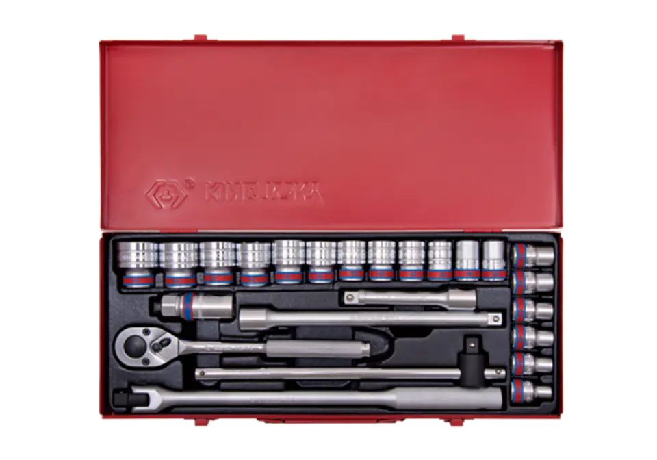 Zestaw narzędzi 1/2" King Tony w metalowej kasecie. W zestawie znajdują się nasadki krótkie, 6-kątne w rozmiarach calowych: 5/16", 3/8", 7/16", 15/32", 1/2", 9/16", 19/32", 5/8", 11/16", 3/4", 25/32", 13/16", 7/8", 15/16", 1", 1-1/16", 1-3/16", 1-1/4", nasadka do świec, 6-kątna, 21 mm, grzechotka z moletowaną rączką, pokrętło przesuwne, pokrętło łamane oraz dwie przedłużki. Karta produktu - 4526SR