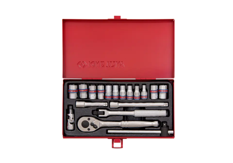 Zestaw profesjonalnych nasadek 1/4" firmy King Tony. W zestawie oprócz nasadek 12 kątnych znajduje się grzechotka, pokrętło łamane, dwie przedłużki, pokrętło przesuwne oraz przegub kardana, a także dwie nasadki 8 kątne o rozmiarach 5/16 i 3/8". Nasadki 12 kątne wchodzące w skład kompletu mają rozmiary 5/32, 3/16, 7/32, 1/4, 9/32, 5/16, 11/32, 3/8, 7/16, 1/2". Zestaw znajduje się w zgrabnej metalowej kasecie. Karta produktu - 2019SR