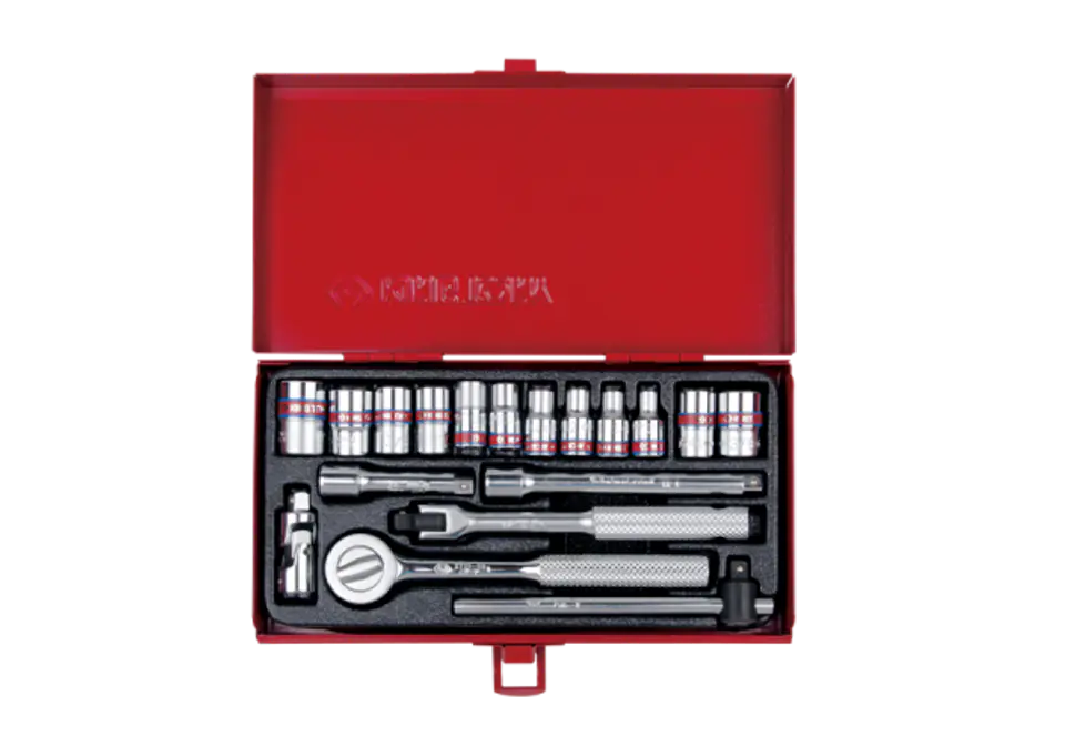W zestawie:- 2335S - nasadka 1/4" krótka 6-kątna w rozmiarach: 5/32 , 3/16 , 7/32 , 1/4 , 9/32 , 5/16 , 11/32 , 3/8 , 7/16 , 1/2"- 2310S - nasadka 1/4" 8-kątna w rozmiarach: 5/16, 3/8"- 2725-55F - grzechotka 1/4" 24 zęby- 2452-05F - pokrętło łamane 1/4", 130 mm - 2571-45 - pokrętło przesuwne 1/4", 115 mm - 2221-02 - przedłużka 1/4", 54 mm - 2221-04 - przedłużka 1/4", 100 mm - 2792 - przegub kardana 1/4" Karta produktu - 2518SR