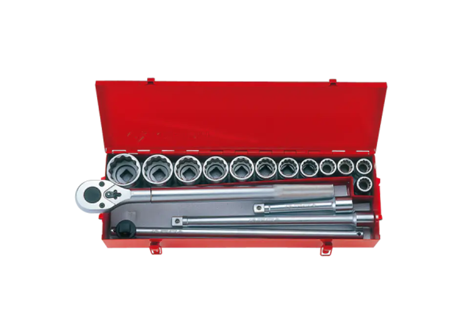 Zestaw narzędzi 3/4" King Tony. W zestawie znajdują się nasadki krótkie 12-kątne w rozmiarach calowych 7/8", 15/16", 1", 1-1/16", 1-1/8", 1-1/4", 1-3/8", 1-1/2", 1-5/8", 1-3/4", 1-7/8", 2", grzechotka z moletowanym uchwytem, dwie chromowane przedłużki oraz pokrętło przesuwne. Zestaw w metalowej kasecie Karta produktu - 6016SR