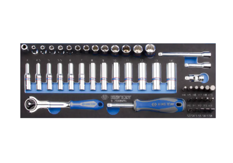 ZESTAW NASADEK I BITÓW 1/4" 48cz. KRÓTKIE / DŁUGIE, 12-kąt. 4 - 14mm Z AKCESORIAMI, WKŁAD Z PIANKI EVA DO WÓZKA King Tony