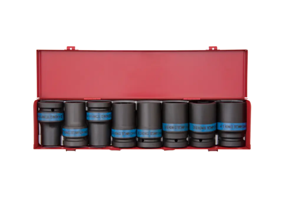 Zestaw długich nasadek udarowych 1" King Tony. W zestawie znajduje się 8 nasadek 24, 27, 30, 32, 33, 36, 38, 41. Zestaw w metalowej kasecie. Karta produktu - 8409MP