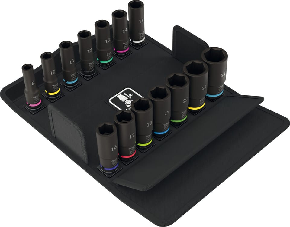 Zestaw z 14 kluczami nasadowymi Impaktor Deep do stosowania z elektrycznymi lub pneumatycznymi wkrętarkami udarowymi 3/8". Wersja długa do głęboko osadzonych połączeń śrubowych i wystających prętów gwintowanych. Technologia Impaktor umożliwia uzyskanie ponadprzeciętnej żywotności narzędzi nawet w wymagających warunkach pracy. Profil sześciokątny umożliwia przenoszenie dużych sił z zachowywaniem precyzji i zabezpieczeniem profilu. System oznaczenia kolorystycznego kluczy według rozmiaru "Take it easy" ułatwiający i przyspieszający odnajdywanie właściwego narzędzia.