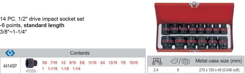 Zestaw krótkich, 6-kątnych nasadek calowych 1/2" firmy King Tony. W zestawie jest 14 nasadek w rozmiarach: 3/8", 7/16", 1/2", 9/16", 5/8", 11/16", 3/4", 13/16", 7/8", 15/16", 1", 1-1/16", 1-1/8", 1-1/4". Zestaw w metalowej kasetce. Karta produktu - 4414SP