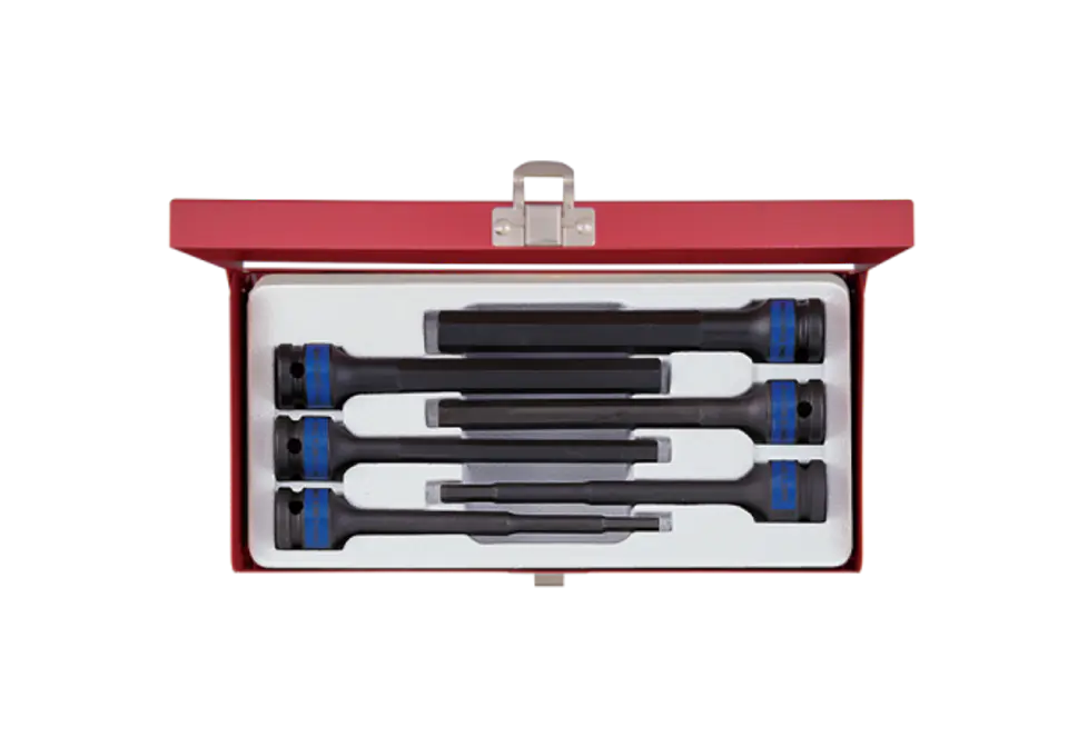 Zestaw extra długich nasadek udarowych 1/2" z końcówką HEX. W zestawie znajdują się nasadki 6 kątne w rozmiarach 5, 6, 8, 10, 12, 14. Nasadki mają 150 mm długości. Zestaw w metalowej kasecie. Karta produktu - 4476MP