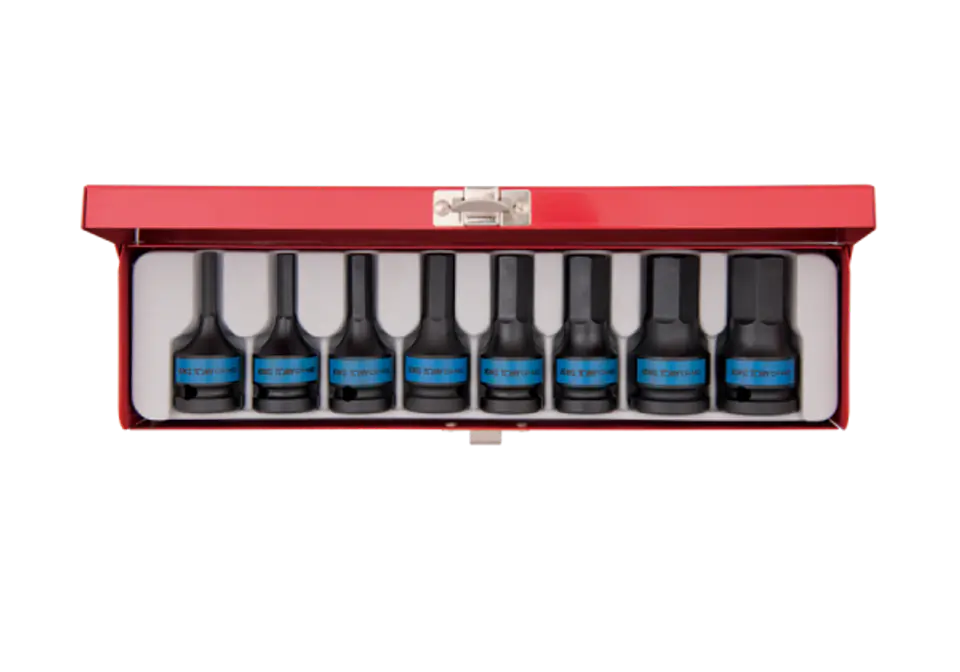 Zestaw 8 nasadek udarowych 1/2" z końcówką HEX firmy King Tony. W zestawie znajdują się nasadki w rozmiarach H5 , H6 , H8 , H10 , H12 , H14 , H17 , H19. Zestaw w czerwonej, metalowej kasecie Karta produktu - 4418mp