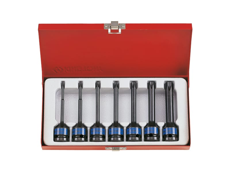 Zestaw nasadek udarowych 1/2" z końcówką Tox firmy King Tony. Zestaw w metalowej kasecie zawiera 7 nasadek długości 100 mm w rozmiarach: T25, T30, T40, T45, T50, T55, T60. Karta produktu - 4467PP