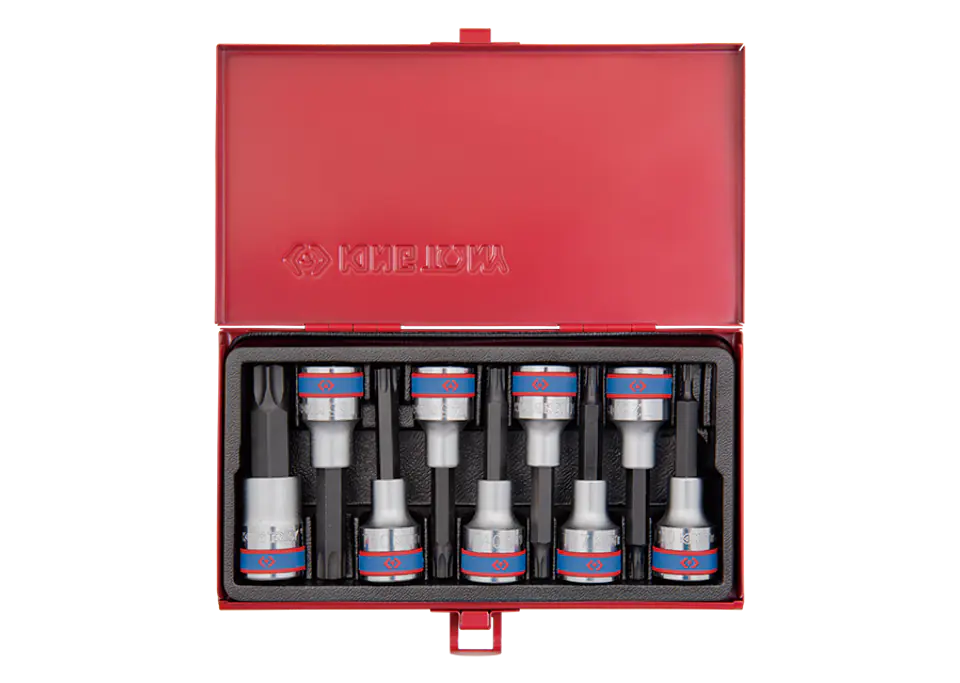 Zestaw nasadek 1/2" z końcówką TORX firmy King Tony. Zestaw w metalowej kasecie zawiera 9 długich nasadek w rozmiarach: T20, T25, T27, T30, T40, T45, T50, T55, T60. Nasadki wykonane ze stali chromowo-wanadowej, bity z chromowo-molibdenowej. Karta produktu - 4119PR
