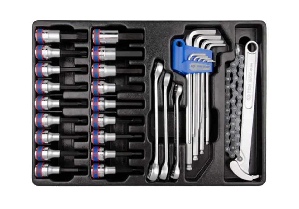 ZESTAW NASADKI Z BITAMI 1/2" 20cz. IMBUSY DŁUGIE HEX Z KULKĄ 9cz. KLUCZ ŁAŃCUCHOWY DO FILTRA OLEJU 3204, WKŁAD DO WÓZKA King Tony