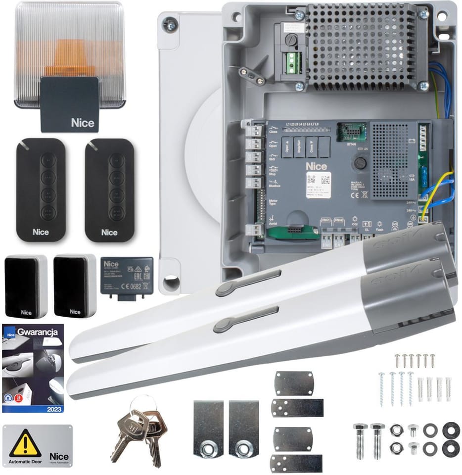 Kompletny zestaw do bram dwuskrzydłowych, pozwalający zautomatyzować bramę o świetle 6 metrów, do pracy intensywnej, wyposażony w najnowsze rozwiązania marki NICE.