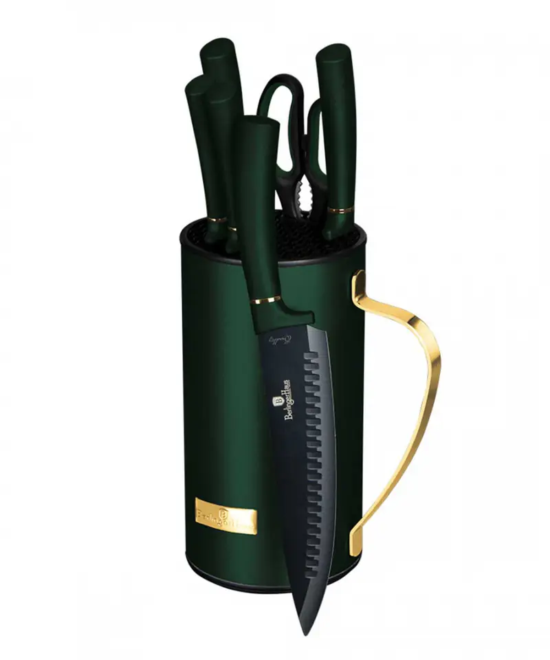 7 elementowy zestaw noży nw bloku firmy BERLINGER HAUS z serii Emerald Collection. Przeznaczone do porcjowania mięsa i ryb, krojenia pieczywa oraz obierania i siekania warzyw. Noże ze stali nierdzewnej dodatkowo pokryte powłoką nieprzywierającą non-stick. Wyposażone w uchwyty pokryte bardzo trwałą cienką warstwą silikonu dla uzyskania pewnego trzymania w każdych warunkach.