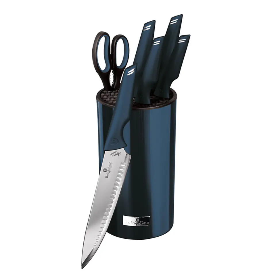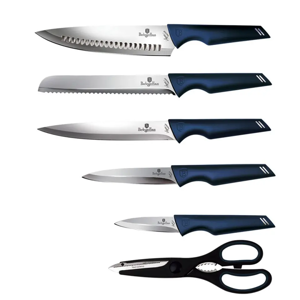 7 elementowy zestaw noży w bloku firmy BERLINGER HAUS z serii AQUAMARINE METALLIC COLLECTION. Przeznaczone do porcjowania mięsa i ryb, krojenia pieczywa oraz obierania i siekania warzyw. Noże ze stali nierdzewnej. Wyposażone w uchwyty pokryte bardzo trwałą cienką warstwą silikonu dla uzyskania pewnego trzymania w każdych warunkach.