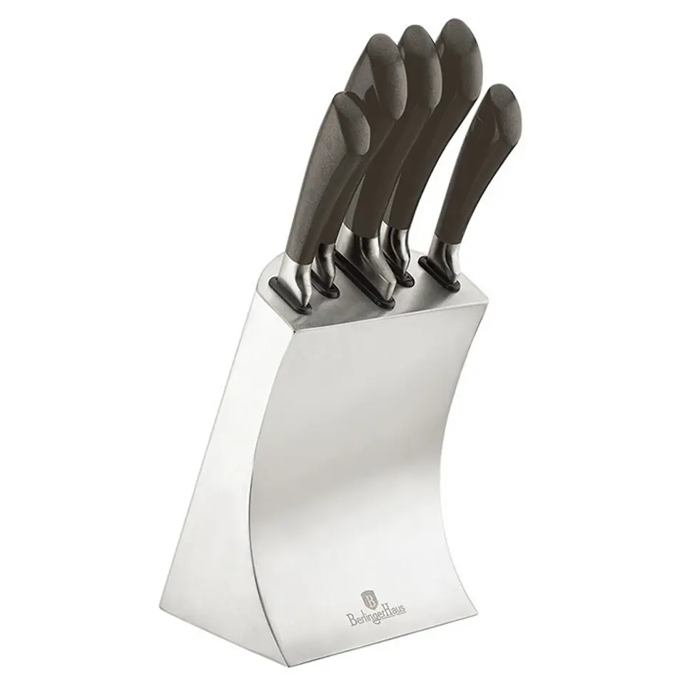 6 elementowy zestaw noży na stojaku ze stali szlachetnej firmy BERLINGERHAUS z serii PASSION (METALLIC CARBON). Przeznaczone do porcjowania mięsa i ryb, krojenia pieczywa oraz obierania i siekania warzyw. Noże wykonane z wysokogatunkowej nierdzewnej stali.. Ostrzone laserowo. Masywne, z okładziną połyskującą w kolorze Carbon.
