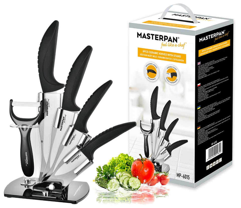 Udoskonal swoje umiejętności kulinarne dzięki zestawowi 6 noży ceramicznych Masterpan, kolekcji premium starannie zaprojektowanej, aby podnieść poziom Twoich doświadczeń w kuchni. Ten zestaw zawiera noże z uchwytami PP wzmocnionymi elementami soft touch w eleganckiej czerni, w połączeniu z białymi ceramicznymi ostrzami, które nie tylko zapewniają precyzyjne cięcie, ale także dodają odrobinę elegancji Twoim narzędziom kuchennym. Zestaw zawiera również obieraczkę PP z ostrzem ceramicznym do wszechstronnego przygotowywania żywności.
