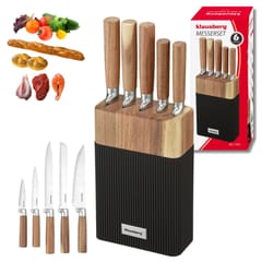 Naturalny design i pełna funkcjonalność w jednym komplecie — KLAUSBERG KB-7981 to elegancki zestaw 6-elementowy, obejmujący 5 kluczowych noży ze stali nierdzewnej oraz stabilny blok z górą z drewna akacjowego. Drewniane rękojeści zapewniają naturalny wygląd i wygodny chwyt, a żebrowany czarny korpus stojaka utrzymuje porządek na blacie i dodaje nowoczesnego charakteru każdej kuchni.