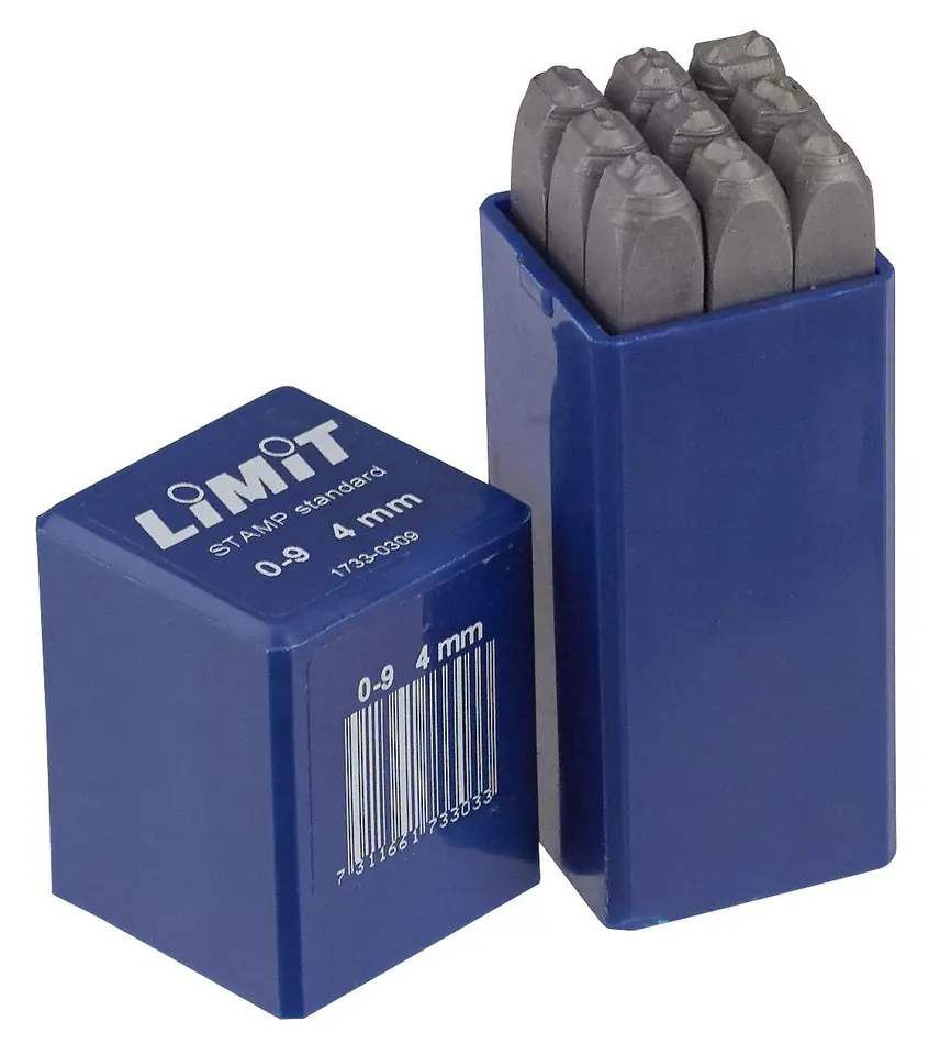Limit. Stemple znakujące do stali i innych metali. 9 stempli z cyframi 0-9. Do wybijania znaków w materiale o wytrzymałości na rozciąganie do 120 kG/mm². Wykonane z hartowanej stali i umieszczone w pudełku z tworzywa sztucznego. Symbole zgodne z DIN 1451. Część robocza hartowana do 58–61 HRC. Krawędzie boczne sfazowane dla polepszenia widoczności. Każdy stempel posiada oznakowanie: Symbol, wielkość symbolu, Made in Germany oraz międzynarodowy symbol zagrożenia dla oczu. Dostarczane w mocnym, udaroodpornym pudełku z tworzywa sztucznego. Poszczególne stemple można kupować w dowolnym zestawieniu, ale nie mniej niż 5 szt. w zamówieniu.