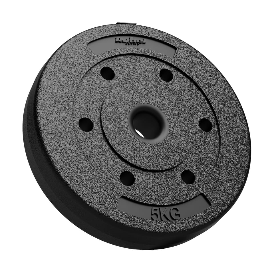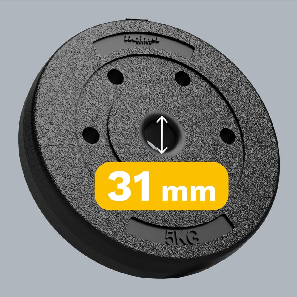 Ilość obciążeń w zestawie: 4Waga talerza: 5 kgWaga zestawu: 20 kgŚrednica otworu: 31 mmŚrednica talerza: 26 cmGrubość talerza: 50 mmPowłoka: PVC----------Tolerancja wagi talerzy ±5%