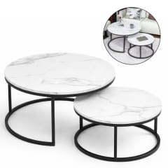 Zestaw okrągłych stolików kawowych 2w1Cechy produktu:- Gładki, okrągły blat wykonany z płyty laminowanej, przypominającej marmur z rdzawymi żyłkami.- Stoliki o dwóch różnych wysokościach blatów, dzięki czemu można wsunąć jeden pod drugi lub rozstawić je w dowolny sposób.- Rama wykonana z metalu, kolor czarny.- Produkt do samodzielnego montażu.Wymiary:- Większy stolik: średnica blatu 80cm, wysokość 45 cm,- Mniejszy stolik: średnica blatu 60cm, wysokość 38 cmProdukt zapakowany w pudełko o wymiarach: 90 x 87 x 9,5 CMWaga:9kg netto / 10kg brutto