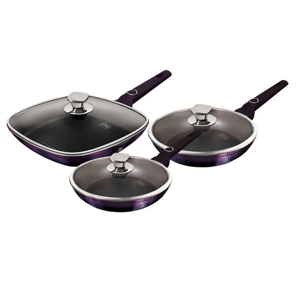 Garnki, patelnie i akcesoria z serii PURPLE ECLIPSE COLLECTION firmy BERLINGER HAUS wykonane są z wysokiej klasy aluminium pokrytego wewnątrz powłoką tytanową o bardzo wysokim współczynniku twardości. Te atrakcyjne i modne naczynia wyposażone są standardowo w uchwyty typu SOFT TOUCH (silikon handle). Przystosowane do wszystkich rodzajów kuchenek: gazowa, elektryczna, ceramiczna, halogenowa, indukcyjna. System TURBO INDUCTION (bardzo szybko nagrzewają się) pozwala zaoszczędzić nawet 35% energii.