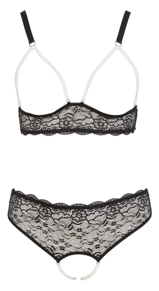 Delicate lace combined with decorative pearls! The wireless bra with a hook-fastener at the back, adjustable straps and pearl chains above the breasts definitely stands out from the rest. The string also has 2 pearl chains over the completely open crotch area. 90% polyamide, 10% elastane.