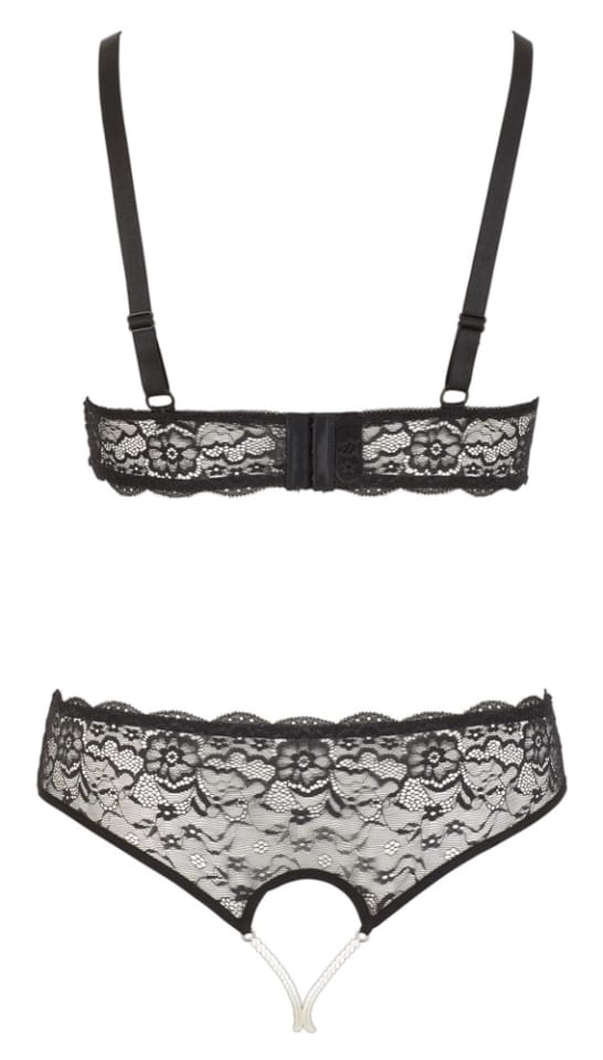 Delicate lace combined with decorative pearls! The wireless bra with a hook-fastener at the back, adjustable straps and pearl chains above the breasts definitely stands out from the rest. The string also has 2 pearl chains over the completely open crotch area. 90% polyamide, 10% elastane.